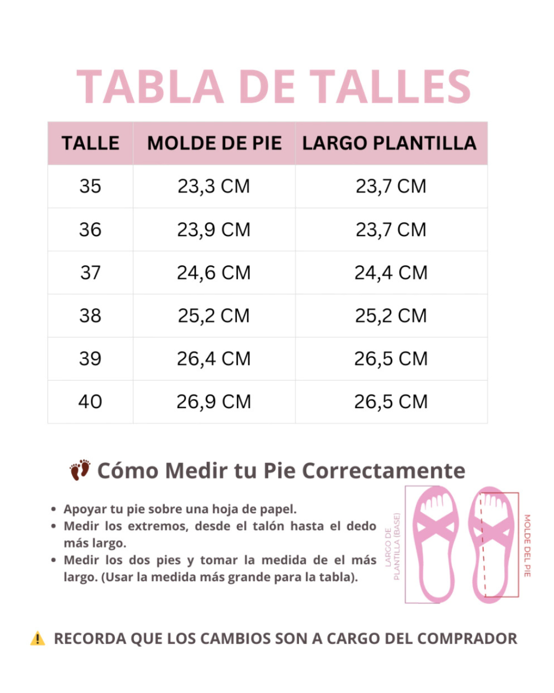 Tenemos guía de talles para que midas tu pie fácil y rápido. Sin vueltas ✨ Recomendamos pedir tu talle habitual ya que la horma es normal.